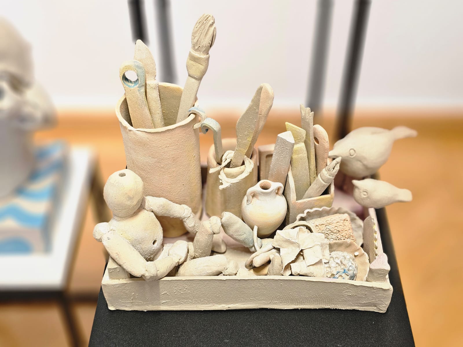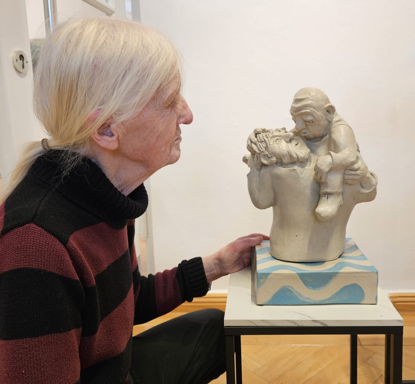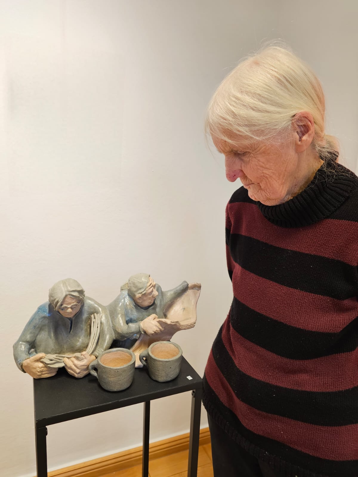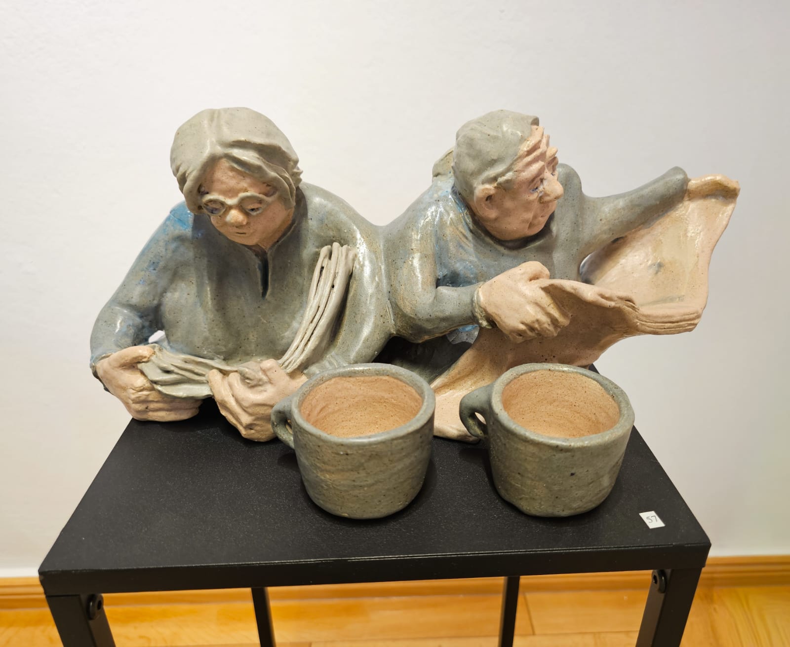Vielleicht sind meine diesjährigen Werke zugänglicher. Zum Beispiel das alte Ehepaar beim Zeitunglesen oder „Christophorus“, der diesmal keinen kleinen Jungen, sondern einen alten Mann auf den Schultern trägt. Sehr persönlich ist auch mein Beitrag „Die alte Kiste“ – darin liegt mein Töpferwerkzeug, sorgfältig verstaut. Werkzeug, das ich bald nicht mehr brauchen werde. Eine leise Auseinandersetzung mit dem Abschied vom aktiven Schaffen.