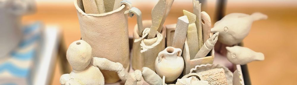 Vielleicht sind meine diesjährigen Werke zugänglicher. Zum Beispiel das alte Ehepaar beim Zeitunglesen oder „Christophorus“, der diesmal keinen kleinen Jungen, sondern einen alten Mann auf den Schultern trägt. Sehr persönlich ist auch mein Beitrag „Die alte Kiste“ – darin liegt mein Töpferwerkzeug, sorgfältig verstaut. Werkzeug, das ich bald nicht mehr brauchen werde. Eine leise Auseinandersetzung mit dem Abschied vom aktiven Schaffen.